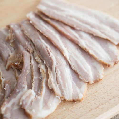 食塩は天然の岩塩を使用し、香辛料と砂糖を肉の表面に丹念にすり込みます。 ほかには何も使っていない、混じりっけなしのピュアなベーコンです。 香ばしいカリカリベーコンが焼けるのは増量材などを含まない証拠です。 ベーコンは脂の質が美味しさの決め手で、しっとりきめの細かい庄内豚のばら肉はベーコンの素材に最適です! 多少厚めでも気にしないしっとりなめらかな仕上がりをお楽しみください